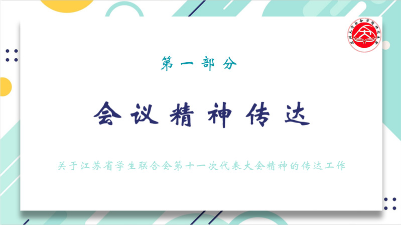 第一部分为会议精神传达。王莎鑫同学带领大家传达领会江苏省学生联合会第十一次代表大会精神,并详细解读了“保护同学具体利益”、“取消‘学生干部’表述”等内容。