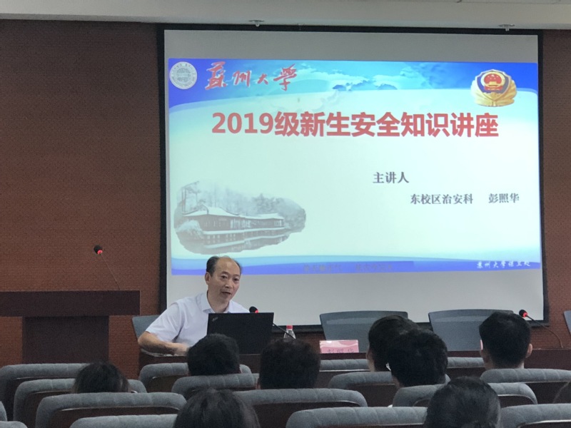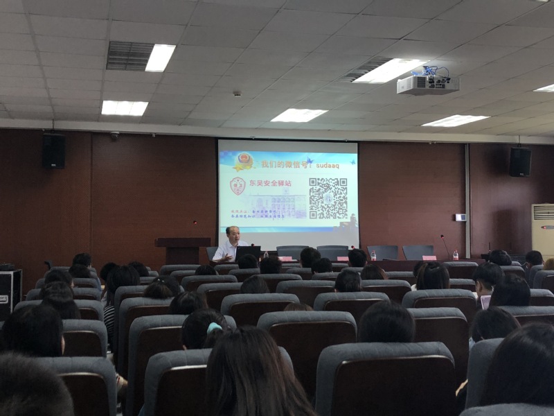 首先彭科长介绍了东吴安全驿站,要求同学们关注微信公众号,以便及时了解学校保卫科对校园日常安全注意事项的各项通知提示和教育指导。