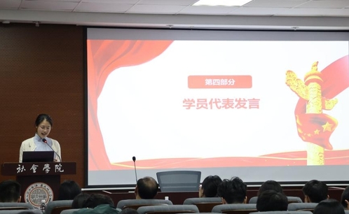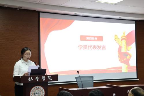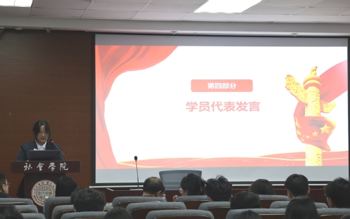 紧接着,培训班学员代表分别发言。积极分子班学员代表、2023级旅游管理专业顾天云同学带领学员回顾了党的光辉历程。她指出,作为新时代青年学子,要提高思想认识,努力勤奋学习,在丰富多彩的校园文化活动中锤炼品格、增长才干,在学习和生活中以身作则、率先垂范,把个人理想追求与国家前途命运紧密结合起来,为实现中华民族伟大复兴的中国梦贡献自己的智慧和力量。发展对象班学员代表、2022级社会学专业张凯欣同学结合自己在分党校培训班的学习体会,向全体学员提出三点倡议:一是深化理论学习,铸牢信仰之基;二是专注专业学习,提升综合素养;三是积极投身实践,践行初心使命。她号召同学们以饱满的热情、昂扬的斗志投入到学习和工作中去,把青春论文写在祖国大地上,为实现中华民族伟大复兴的中国梦贡献力量。预备党员班学员代表、2021级历史学(师范)专业郭韵雨同学结合先锋模范事迹分享了自己的学习感悟。她表示,作为预备党员,必须强化党的创新理论学习,并做到“绝知此事要躬行”,主动投身社会实践,以知行合一的实际行动践行党的初心使命。