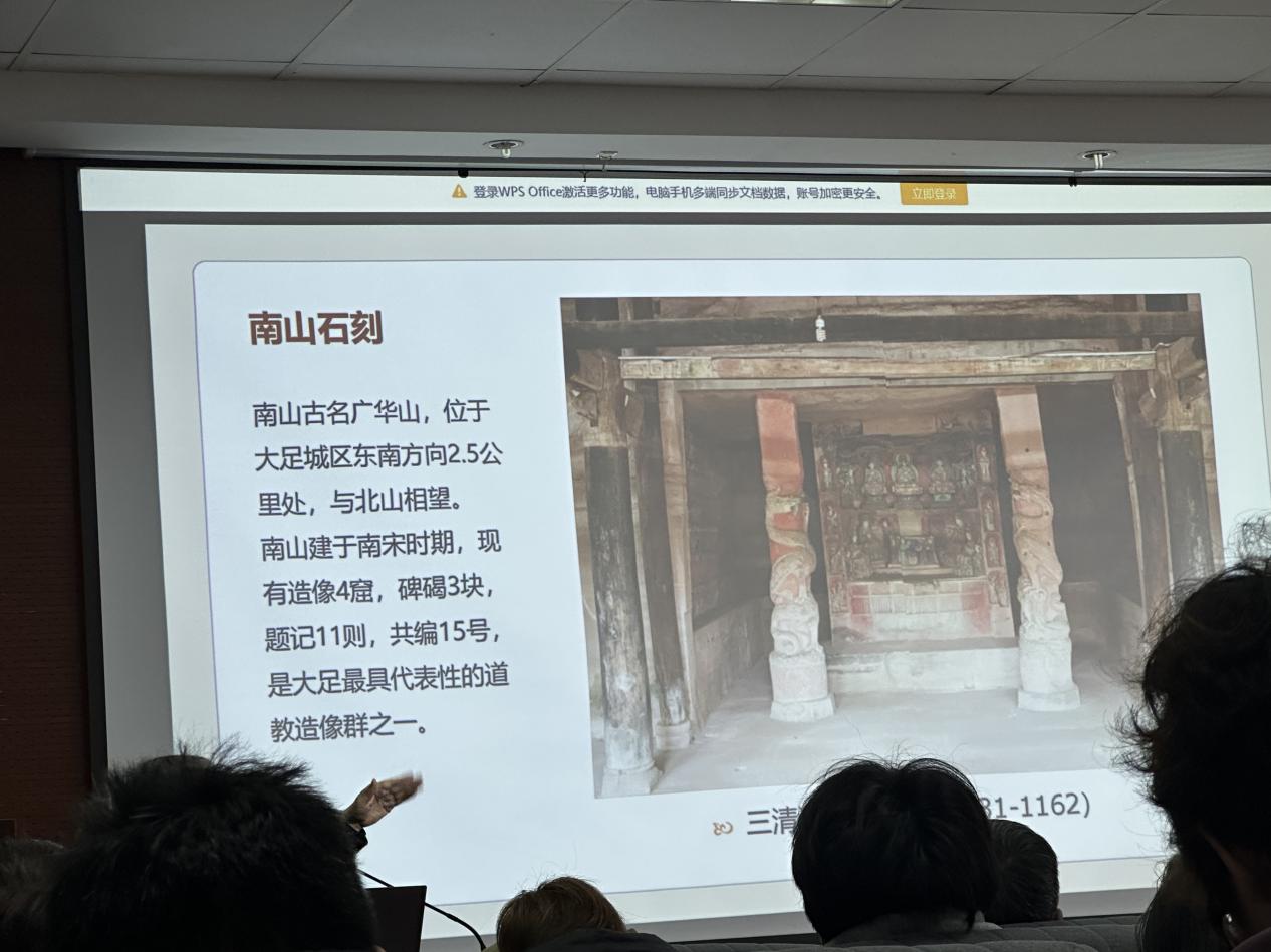 米德昉博士将“从大足石刻看唐宋雕塑的世俗化转向”作为主题,通过丰富多彩的图片,层层剥开唐宋雕塑的艺术密码:相较于唐代雕塑以宗教神性为主导的创作理念,宋代大足石刻通过市井题材的引入,实现了“从佛国到人间”的突破性转向。这一转变不仅体现在题材的丰富性上,更映射了宋代商品经济繁荣与市民阶层崛起的时代背景。
