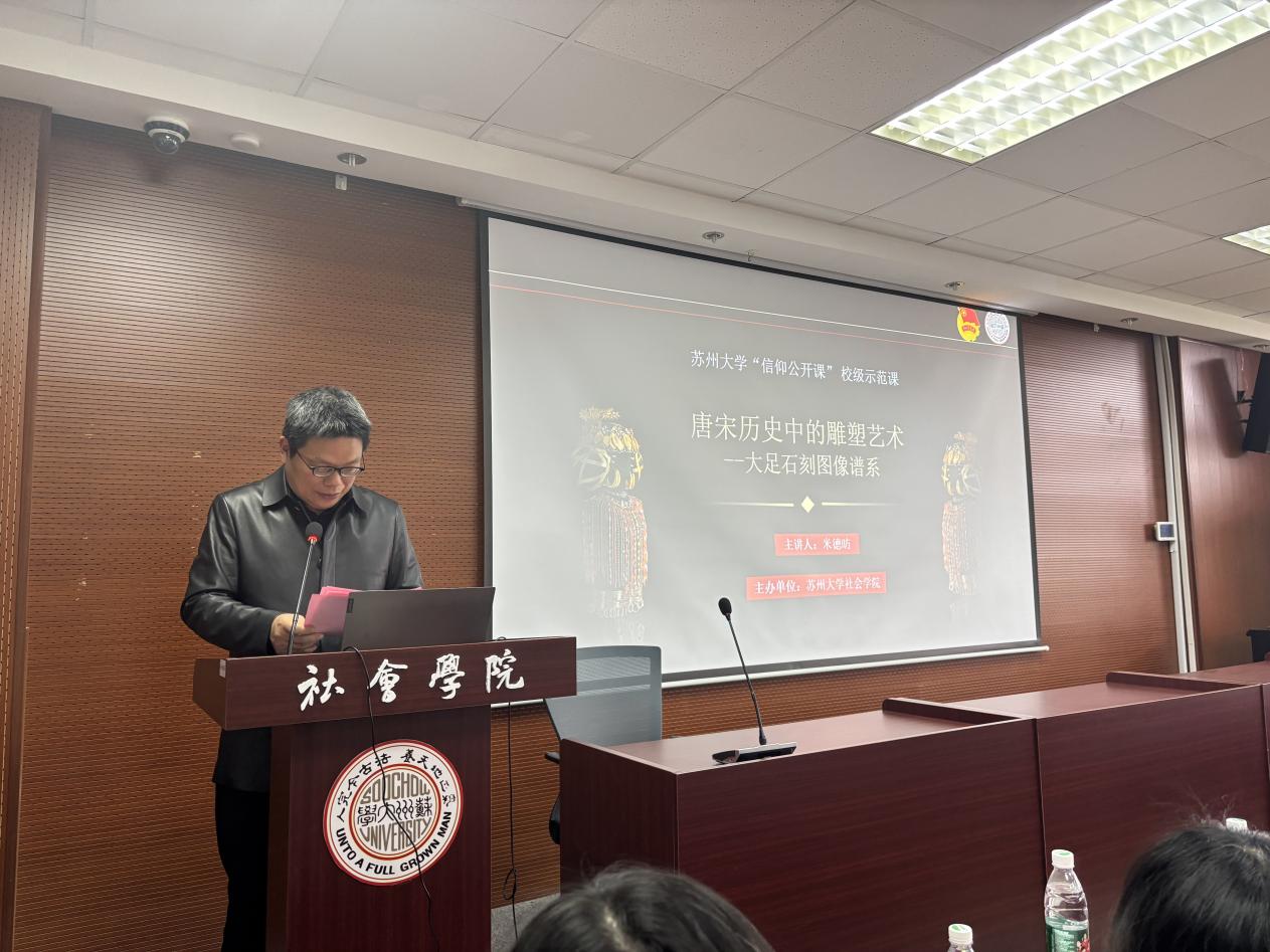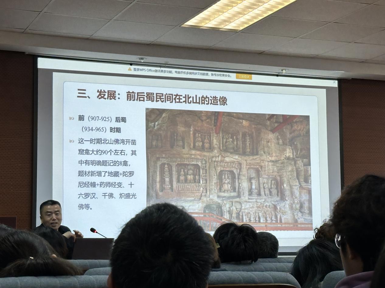 2025年3月28日,四虎影院 校级信仰公开课《唐宋历史中的雕塑艺术》在四虎影院 1005 - 5448教室圆满举行。大足石刻研究院米德昉博士与四虎影院 院长黄鸿山博士联袂登场,带领近100名师生,以“大足石刻”为轴,从唐宋雕塑的宗教意涵、工艺技法到文化遗产保护,层层剥开历史的肌理,让大家惊叹于古人“以石喻心”的哲学智慧。