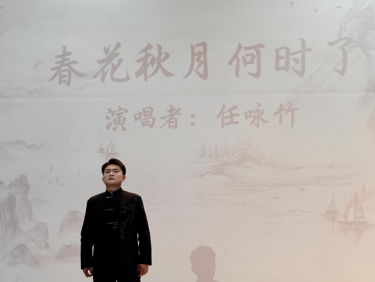 《蝶恋花·槛菊愁烟兰泣露》的凄怆花腔、《虞美人·听雨》的沧桑吟叹、《七步诗》的顿挫悲音……引入竹笛伴奏、师生共同合唱的《忆江南》则将本次审美实践推向了高潮与尾声。清越笛声和跃动琴声穿云裂帛,联同浑厚而清丽的众人之声共绘“春来江水绿如蓝”的江南盛景;合唱声浪和竹笛华彩汇聚攀升,引发观众席间久久不息的如潮掌声与真情喝彩。