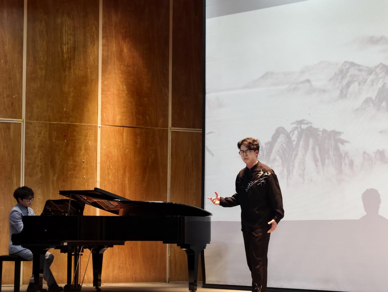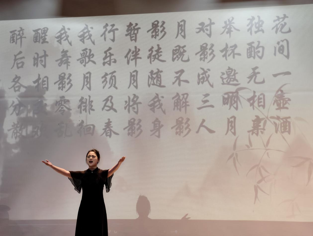 开场曲《月下独酌》的钢琴前奏如清泉流淌,演唱者严文君老师的嗓音空灵缥缈,将“举杯邀明月,对影成三人”的孤寂与超然娓娓道来;苏轼名篇《江城子·乙卯正月二十日夜记梦》的钢琴伴奏,则以回旋低音的节律铺陈“十年生死两茫茫”的深沉哀思,渲染月下二人深情对视的朦胧画卷……琴键起伏、歌声顿挫,乐音的符号细雨般漫过观众席,闭目凝神、指尖轻敲椅背,千年的孤高与愁长力透时光阴霾,悄然叩击着台下学子的被唤醒的心扉。