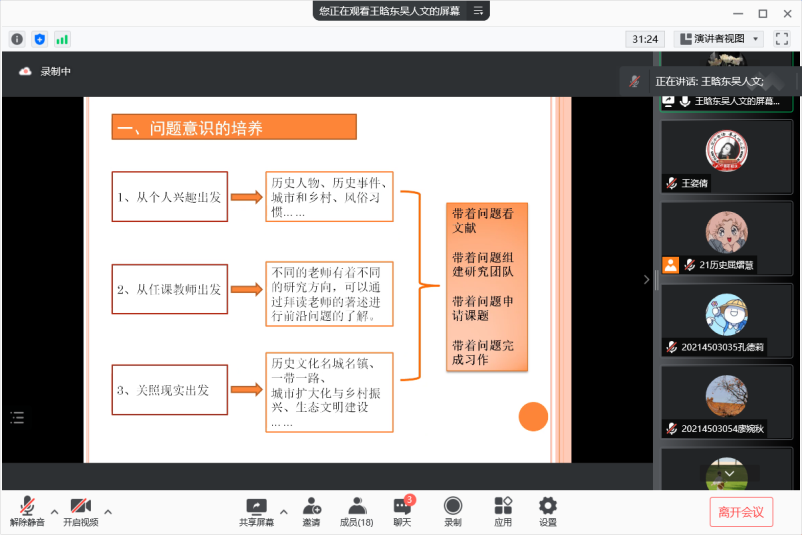 首先是问题意识的培养。王晗老师从三个方面谈起。第一,从个人兴趣出发。兴趣是最好的老师,历史人物、事件、城市和乡村、风俗习惯等等都能作为培养个人兴趣的点,只有对学习研究产生兴趣才能走的更远。第二,从任课教师的学术研究出发。老师是同学们学习的引路人。不同的老师有着不同的研究方向,可以通过拜读老师的著述进行前沿问题的了解。四虎影院 有历史学、社会学、档案学、管理学、图书馆情报学等五个学科门类,拥有很多海内外知名高校学术背景的老师,他们在各自研究方向上多有建树,因此同学们可以向不同的老师寻求帮助来获得学术上的指导,争做新文科教育下的复合型人才。第三,从关照现实出发。同学们或许会对历史学学习、历史师范学习产生疑问,不知道自己未来要学什么,要怎么学。其实同学们应当将学术研究与现实社会联系起来,一些热点话题如一带一路、城市扩大化与乡村振兴、生态文明建设都可以成为同学们的研究对象。通过以上三个方面对问题意识的培养,同学们最终要达到带着问题看文献、带着问题组建研究团队、带着问题申请课题、带着问题完成习作。这样循序渐进的学习过程,可以更好地完成历史学方面有深度的学习和积累。