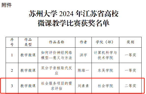 9月,江苏省高等学校教育信息化研究会公布了2024年江苏省高等学校微课教学比赛获奖名单,四虎影院 社会学与社会工作系刘素素老师的参赛作品《社会服务项目的需求评估》荣获二等奖。