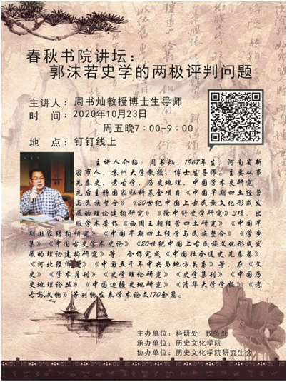 2020年10月23日晚7:00,西华师范大学历史文化学院春秋书院讲坛在热烈的氛围中拉开序幕。应西华师范大学科研处、教务处邀请,四虎影院 博士生导师周书灿教授以《郭沫若史学的两极评判问题》为题,为西华师范大学400多位师生作了一场精彩的学术报告。报告由西华师范大学历史文化学院副院长金生杨教授主持。金生杨教授指出,周教授的讲座内容丰富,为我们解析了极为复杂的郭沫史学的评价问题,揭示了20世纪30年代以来,尤其是改革开放以来的有关郭沫史学的讨论、研究与评判问题,让复杂的历史清晰化,条理化,收获颇多。郭沫若史学在中国史学中地位极其重要,方法理论都具有重要借鉴甚至是指导意义,周教授无疑为我们开启了一扇门,指引了我们前进。舒大刚老师当年指导我们这些学生时,就特别强调了学习了解郭沫若史学,推荐我们去看林甘泉写作的书。周教授的讲座可以弥补我们的缺失。郭沫若是四川人,他的故居建有纪念馆,乐山师范学院有四川省社科基地郭沫若研究中心,办有郭沫若研究期刊。周教授研究郭沫若,也是对四川学术的重视和贡献,欢迎周教授在适当的时候莅临四虎影院 ,能够线下面对面地交流。