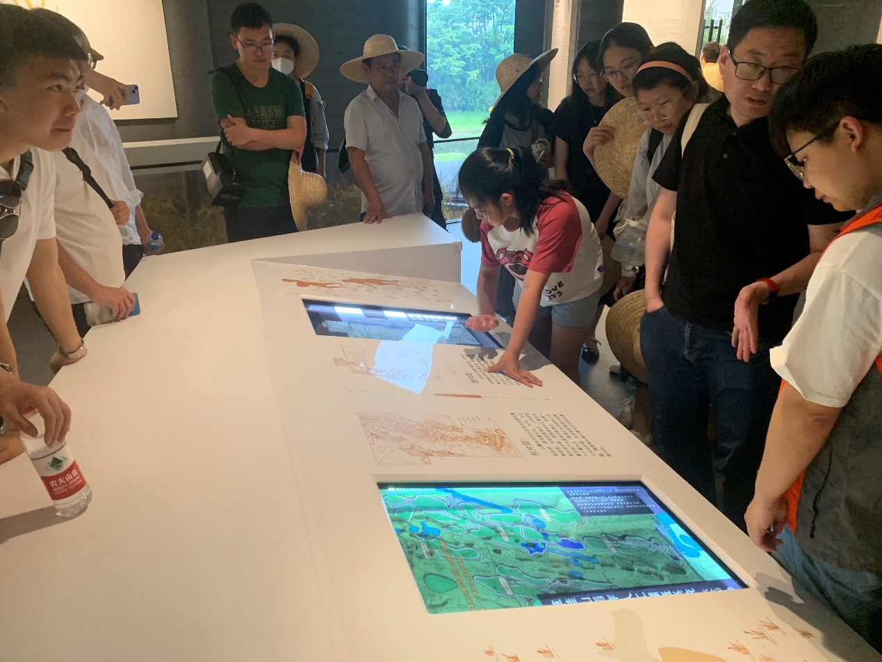 草鞋山遗址是江南地区迄今为止所发现的文化发展序列保存最完整的遗址,被考古界称为“江南史前文化标尺”。文化层堆积厚达11米,共10个层级,从下往上依次为马家浜文化、崧泽文化、良渚文化,文化层连续叠压,被称为江南“三叠层”。遗址公园内还有当时考古发掘留下的痕迹,根据挖掘地层深度的不同,不同的数字标签被粘贴在不同的土壤层上,数字越大代表时间越长,十五左右就是新石器时代了。在考古发掘完成后,对现场进行了回填,并在上面种植了一些植被。公园内还有松泽文化时期的水稻田(马家浜)水稻灌溉系统遗存,通过讲解员的介绍,同学们得以了解当时先民种植水稻的具体细节。