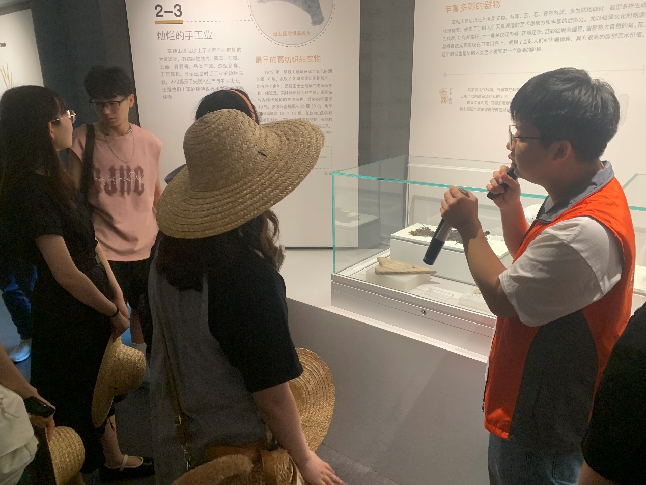 在展馆内,同学们被馆中陈列的各种出土文物所吸引,也感受到草鞋山文化的魅力,感受到中华文明的源远流长。草鞋山遗址首次在史前墓葬中出土玉琮,该玉琮被称为“中华第一玉琮”,打破了对玉琮年代以及社会等级分化的原有普遍认知。馆内展示了当时淳朴简洁的墓葬,从平民墓葬和首领墓葬的差别,可以看到当时已经出现了阶级分化。同时,首领是女性,可见当时是母系氏族社会。展馆中的玉璧、釜、豆、陶鼎等文物,也让同学们对当时人们的生活状况有所了解。其中,双耳黑皮陶壶颜色呈黑色,是用烟熏制的。烟熏所形成的炭粒,密度较小,因而该工艺用于制作炊具是合适的。草鞋山遗址的水稻田灌溉系统也是一大特色,灌溉系统和饮水系统不同,灌溉系统的设计需要考虑灌溉工具的使用和灌溉程序的便捷性,草鞋山遗址中发现的水稻田灌溉系统很好地兼顾了这两点,体现出先民的智慧。