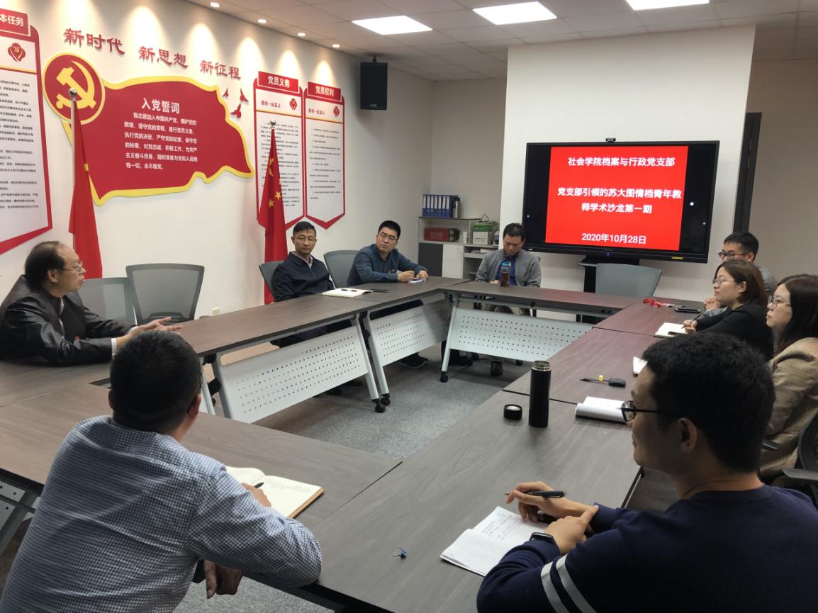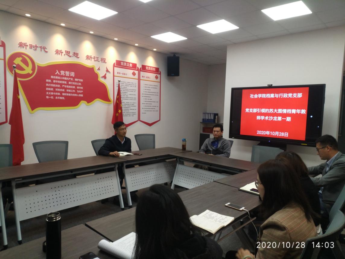 2020年10月28日下午1点30分至3点30分,档案与行政党支部10月份主题党日活动暨苏大图情档青年教师学术沙龙第一期在四虎影院 党建活动室开展。此次活动是档案与行政党支部对四虎影院 支部书记项目“支部引领的苏大图情档青年教师学术沙龙项目的建设与推进”的具体实施。