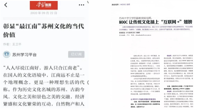 (王卫平《彰显“最江南”苏州文化的当代价值》入选“学习强国”平台、《在线学习》杂志刊登对团队成员杨旭辉的专访《MOOC让传统文化插上“互联网+”翅膀》)