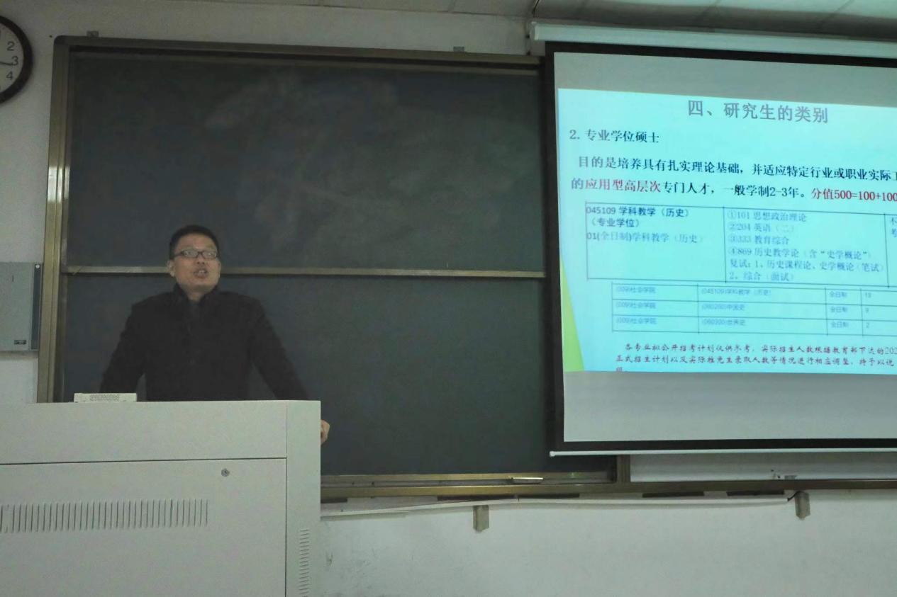 黄老师首先指出,本校历史学(师范)专业的目标是培养优秀的中学历史老师,接着他介绍了四虎影院 是省内最早设立历史学(师范)本科专业的学校,苏大的历史学(师范)专业具有深厚的历史底蕴和一定的专业优势。然后,为了向我们展现社会需要,黄老师从小切口进入,以近年来苏州工业园区招聘历史教师的情况为例进行分析,指出本科学历已经不能完全符合社会需要,本科生毕业以后在就业方面处于劣势,指出读研的现实必要性。