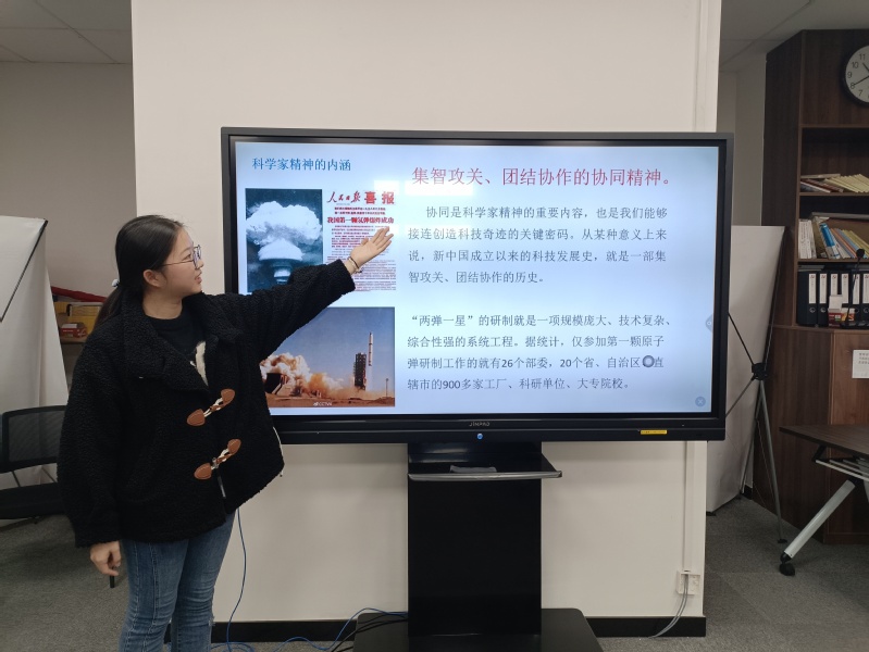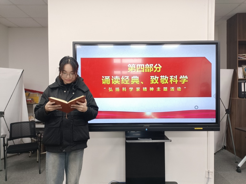 科学家精神是几代科学家群体的成长与中国科技发展的实践同频共振的结晶,是中华优秀传统文化和改革开放时代精神的集中体现。李佳馨同学向我们深刻阐述了科学家精神的内涵,从“中国航天之父”钱学森胸怀祖国、服务人民的爱国精神,到“中国天眼之父”南仁东勇攀高峰、敢为人先的创新精神,再到“中国地质学之父”李四光追求真理、严谨治学的求实精神,无一不体现着科学家浓厚的家国情怀与强烈的社会责任感。研究生第一党支部的张小蝶同学分享了自己的感悟,她说:“我们要以这些科学家为榜样,追求科学的纯洁信念,做自己力所能及的事情,为将我国建设成为社会主义现代化强国贡献绵薄之力”。