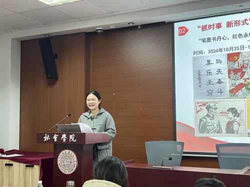活动第二项议程为本期培训班特色活动书画比赛优秀作品展示及党建书屋阅读心得分享环节。首先由王思蕾、韦小米和李一桐三位在书画比赛中获奖的同学带来作品展示,她们围绕作品创作背景、创作理念和创作感悟进行解读,生动展现出作品背后新时代青年奋发向上的精神风貌。