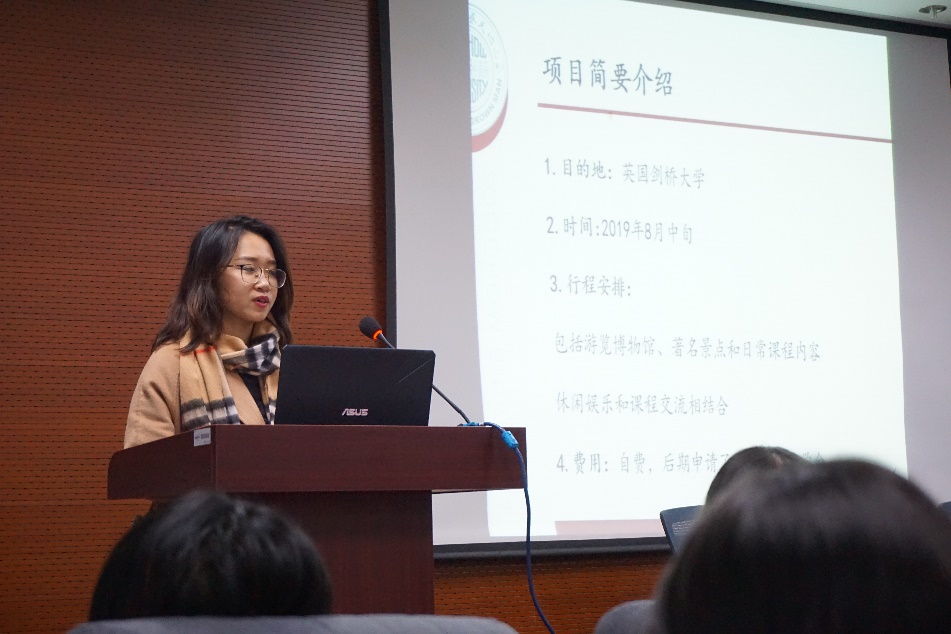 然后,王圣云、苏广新同学上台演讲。王同学与大家分享了在台湾学习交流的经历,介绍了台湾学校丰富多彩的生活和自己的一系列感悟。苏同学与大家分享了在英国剑桥大学暑期短期交流访学的经历。她提醒同学们关注通知发文等交流信息,结合专业、费用等因素综合考量,寻找到最适合自己的交流项目。剑桥大学的生活丰富多彩,拓宽了她的国际视野,塑造了自我个性,锻炼了独立能力,给她带来了多重选择。