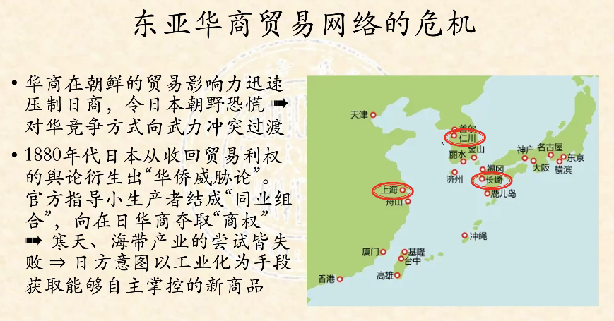 详言之,在日本当局加强对华战备的同时,日商则开始探索摆脱华商贸易网络的途径,并尝试建立自主贸易渠道。而其在传统行业多次失败后,便将打开贸易局面的希望寄托于进行工业化。自1880年代中期起,日商抓住国际机遇,在棉纺织领域着手工业化改革,并初现成效。甲午战争结束时,日商已能在近代化棉纱纺织领域的原料采购、运输、生产等环节摆脱对华商的依赖。不仅如此,在中日两国签署《马关条约》后,日商还得以在日本当局政治手段的协助下,于台湾及朝鲜压倒华商势力,并利用清朝赔款加速完成工业化。在诸多有利条件之下,此后直至日俄战争爆发的十年间,日商不断侵占华商在东亚国际贸易中的份额。日俄战争结束后,日商已基本控制来自中国的商品进口,并能独立进行日货对华北及华东出口,华商则仅保留部分日货的对华出口渠道而已。到一战前夕,东亚日商贸易网络基本形成,而该过程亦可视为对东亚华商贸易网络的肢解与取代。