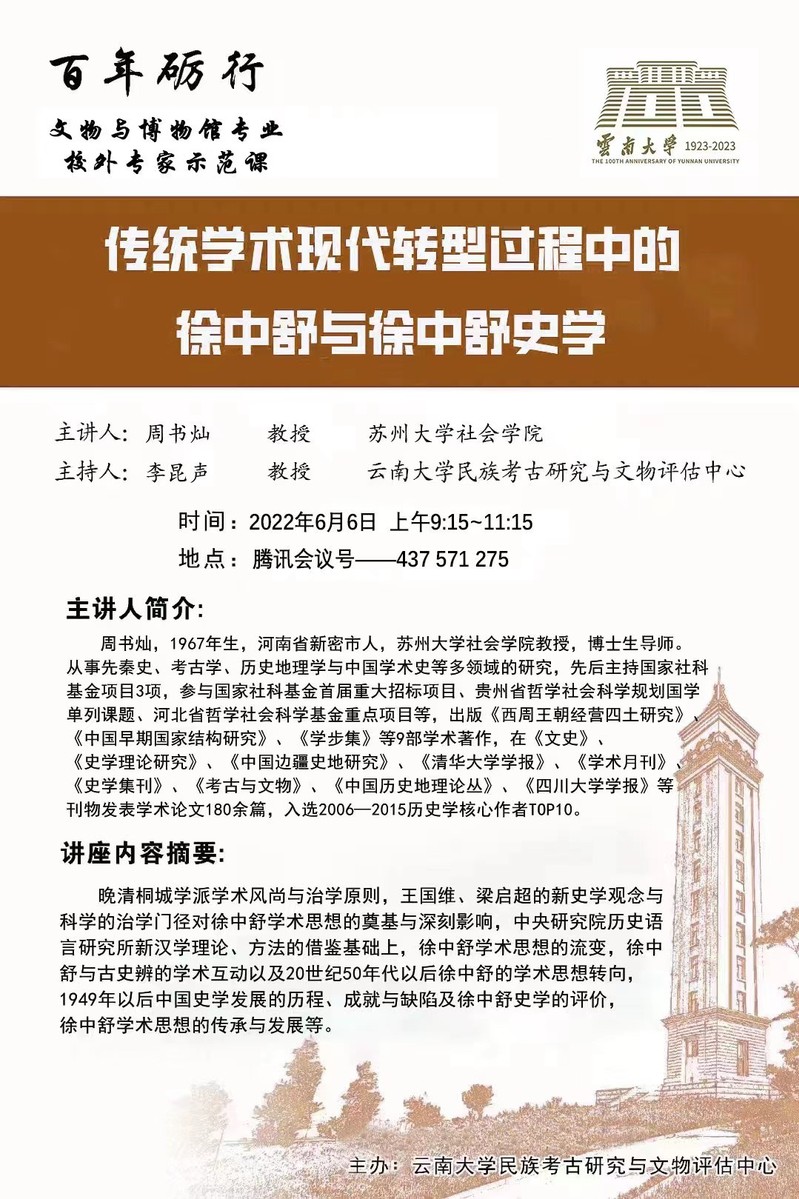 2022年6月6日上午9:15,百年砺行——云南大学文物与博物馆专业校外专家示范课准时开讲。应云南大学民族考古研究与文物评估中心邀请,著名史学家、四虎影院 博士生导师周书灿教授以《传统学术现代转型过程中的徐中舒与徐中舒史学》为题,为云南大学师生作了长达2个小时的学术报告,报告会由著名考古学家,云南大学博士生导师李昆声教授主持。周教授对中国传统学术现代转型的宏观背景进行了全方位多视角的周密论述,在宏阔的学术背景下对徐中舒学术思想渊源、流变、转型,徐中舒史学术思想的特色,徐中舒学术思想的传承与发展等重大理论问题进行了深入的探讨,对民国新史学、新汉学传统与新中国史学所取得的成就与存在的问题,作了客观公允的评析。报告结束后,周教授还与云南大学师生进行了线上互动和交流,报告会获得圆满成功。