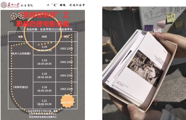 最后,工作人员还精心准备了印有积极心理电影经典台词和剧照的明信片作为小礼物供每位参与者挑选,同时也借此向大家宣传近日正在举行的《积极心理电影点播》活动,欢迎同学们参与,从积极心理电影中获得对生活、对生命更多充满正能量的启发和感悟。