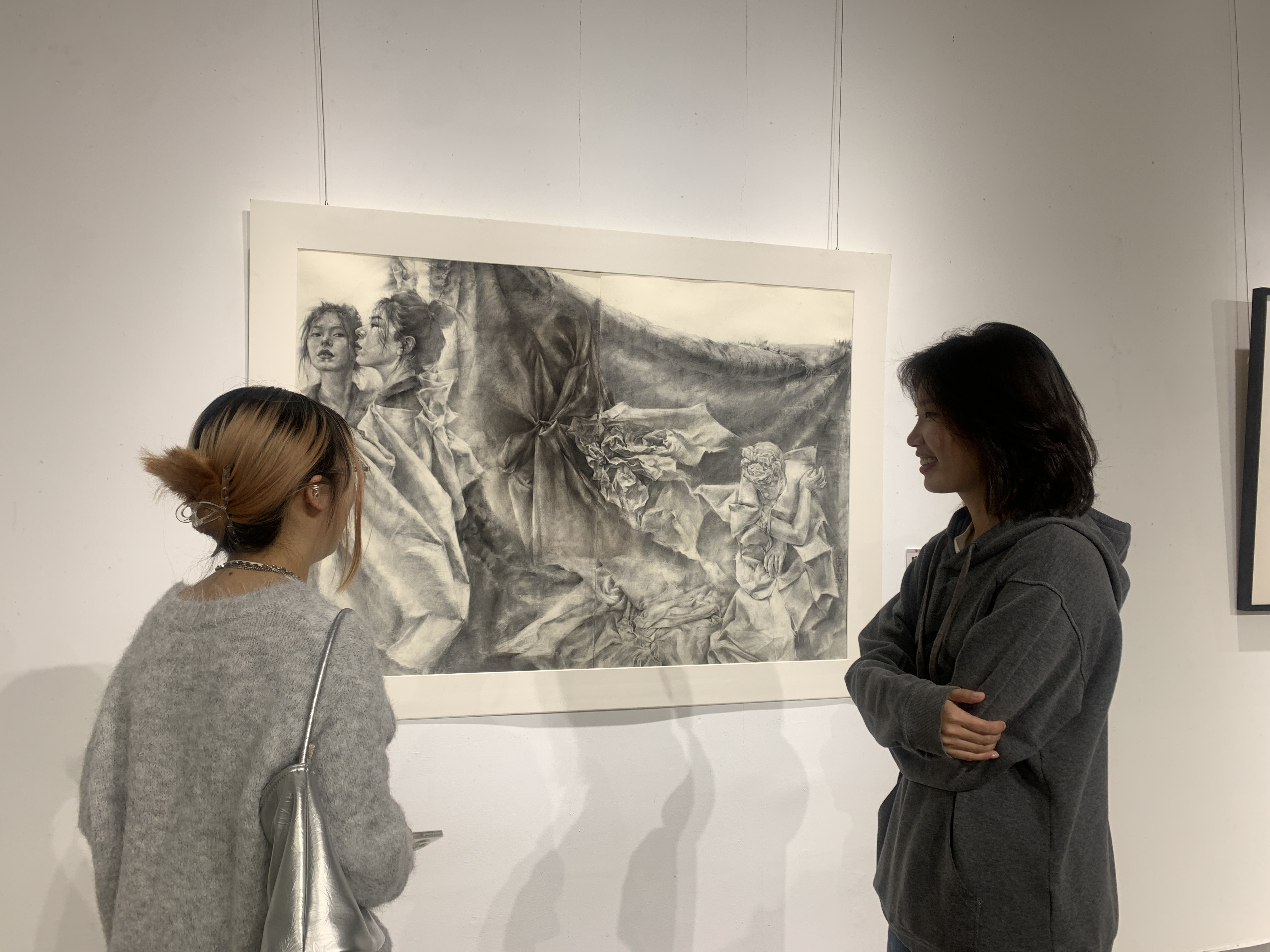 在参观的过程中,学院专门邀请了艺术学院美术系张意泊老师、18油画毕业生李圆圆、参展学生蒋吉雅、胡湘艺、傅江讲述创作灵感、创作过程、创作技法,进一步帮助大家加深对于作品的理解,得到新的启发。同时也有同学主动分享自己对于某一幅画的感受与见解,与大家进行交流讨论。