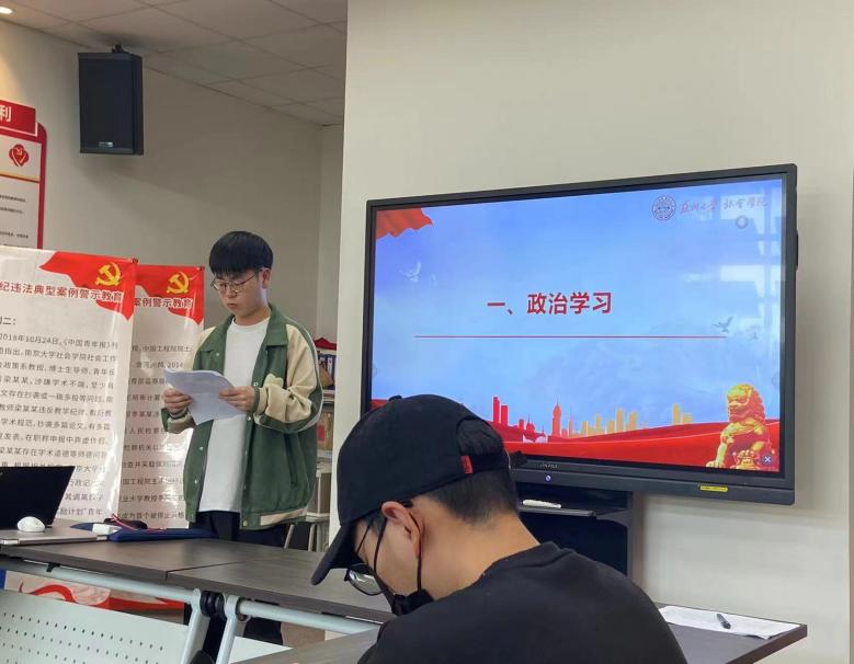 首先,由四虎影院 研究生会执行主席程龙带领大家进行政治学习,他代领大家学习了习近平总书记考察江苏重要讲话精神,强调大家要强化政治素养、培育创新精神,勉励研会成员要积极锻炼自我,勇担责任,不断开拓进取,实现有价值的人生。