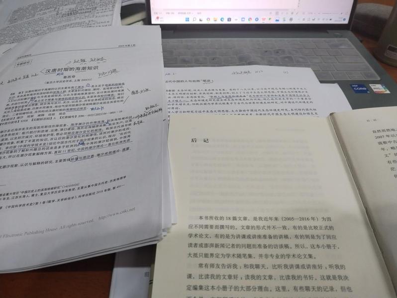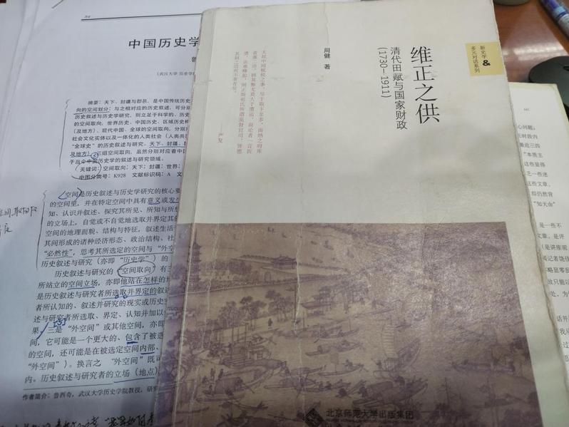 五一假期,我坚持学习专业知识,充实自己。专著方面,我主要阅读了周健的《维正之供:清代田赋与国家财政(1030-1911)》和王业键的《清代田赋刍论1750-1911》,对清代的田赋状况、赋役结构等内容有了进一步的了解和认知。我还阅读了鲁西奇教授的《谁的历史》,其中他在后记中写道:“我需要自责的是:我常常没有能力写清楚自己想说的话,有时候顾虑太多,缺乏勇气,不够坚强。”读到此处,我感慨颇深。论文方面,我阅读了鲁西奇老师的《中国历史学的空间取向》、《汉唐时期的海潮知识》等等以及王利华教授有关环境史的论文,如《历史地认识“人类世”的“不对称”》、《关于中国近代环境史的若干思考》等,并做了较为详实的读书笔记,并在学习中也产生了很多的思考和体悟。