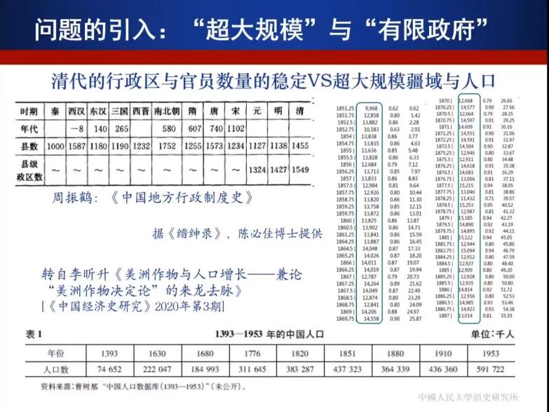 随后,胡老师从“超大规模”和“有限政府”之间的矛盾引入本次讲座的探讨话题。他指出,中国从古至今都是一个规模较大的国家,无论是疆域规模还是人口规模皆是如此,体现了一种历史的延续性,到了清代又发展到了一个新的高峰,但是,与之冲突的一点是中国行政区划特别是县级政区和官僚队伍的数量保持了基本的稳定。胡老师引用陈必佳博士基于《缙绅录》量化数据库所做的统计数据指出:清代正式官员数量基本维持在14000名上下,晚清由于新设了一些官僚机构,官员数量略有增长,但总体上仍呈现稳定态势。