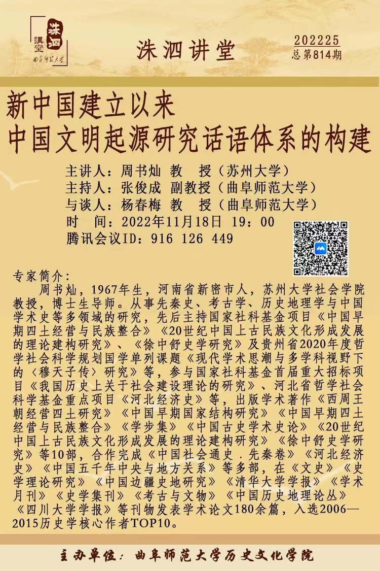 2022年11月18日晚19:00,由著名历史学家、四虎影院 博士生导师周书灿教授担任主讲的洙泗讲堂总第814期如期开讲。本次讲座由曲阜师范大学历史文化学院主办,由著名古文字学家张俊成教授主持。张俊成教授介绍了周书灿教授的主要学术领域、治学作风和学术特色。周书灿教授以《新中国建立以来中国文明起源研究话语体系的构建》为题,旁征博引,深入浅出,详尽地论述了新中国以来各个历史时期中国文明起源研究所取得的瞩目的成就,充分肯定了各个时期学者对中国文明起源研究话语体系构建所做的贡献,同时也从学术史视角,指出中国文明起源研究中还存在着概念混乱,术语使用随意,学理混乱等问题。周教授的报告立足学术前沿,思想深刻,洞见深邃,评论客观公允,具有重要的学术前瞻性和开拓性。曲阜师范大学师生及线上听众约200多人聆听了周教授的报告。报告结束后,杨春梅教授对周书灿教授的报告作了精彩点评,并就报告中的若干问题和周教授进行了线上互动。周教授还当场回答了曲阜师范大学师生及线上听众就“最早的中国”、三星堆文化在中华文明形成发展过程中的地位与作用以及田野考古资料可否与古史传说契合等问题。21:40分,在师生及线上听众的感谢声中,报告结束。